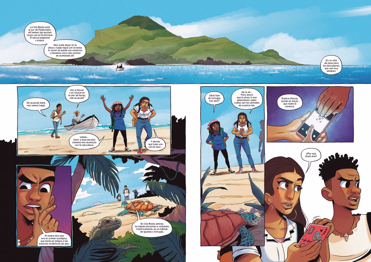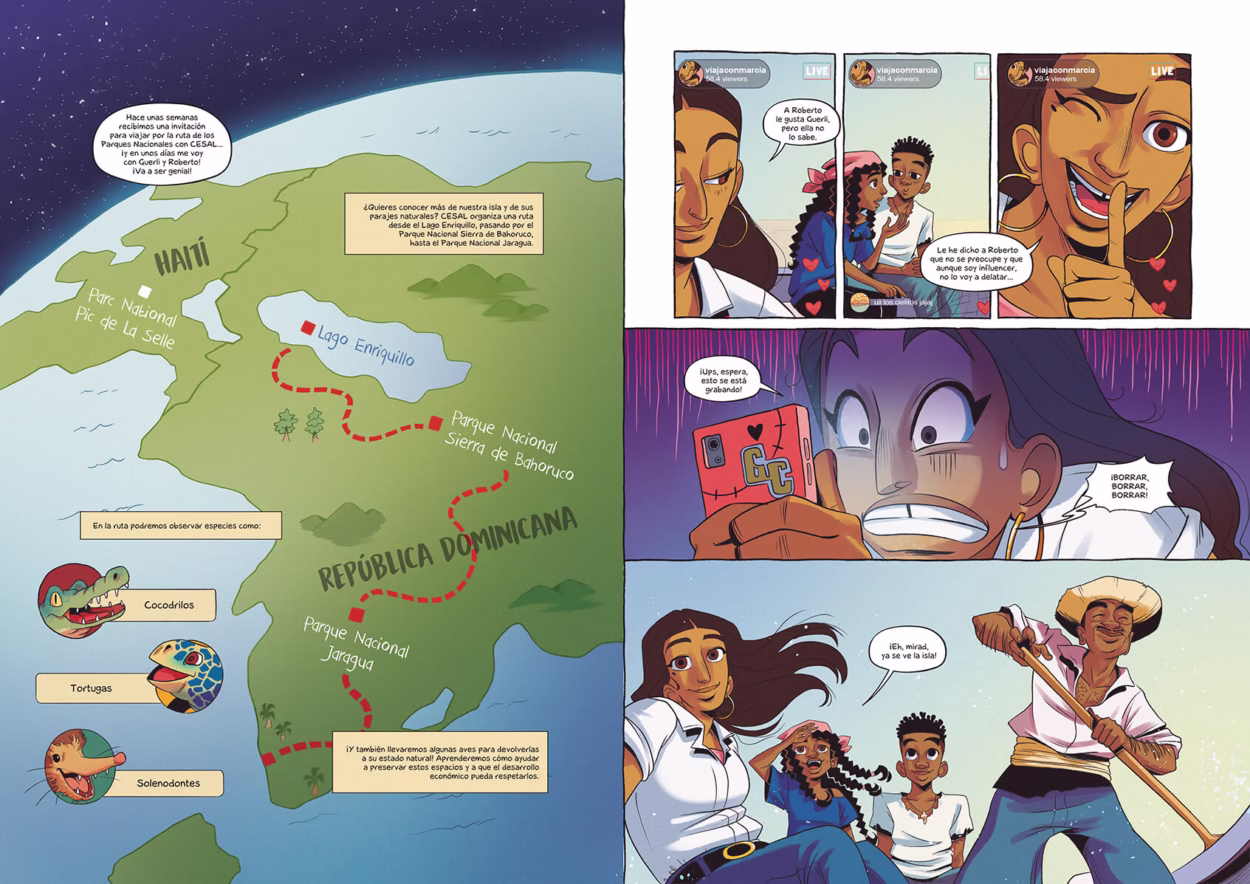 El cómic es así un recorrido por los parques naturales de la isla acompañando a Roberto, Guerli y Marcia, unos/as jóvenes de los dos países, y a las personas cooperantes de la ONG Cesal. En el cómic se pueden ver especies autóctonas y endémicas de la isla como el solenodonte, la iguana de Riccord o la jutía, y árboles como la bayahonda o las palmas reales.