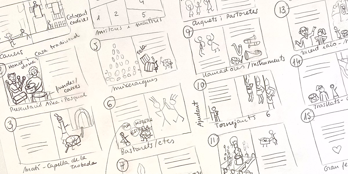Diseño de personajes principales (Aïna la dolçaina i Pasqual el tabal), storyboard, ilustraciones y portada con lettering (letra dibujada).