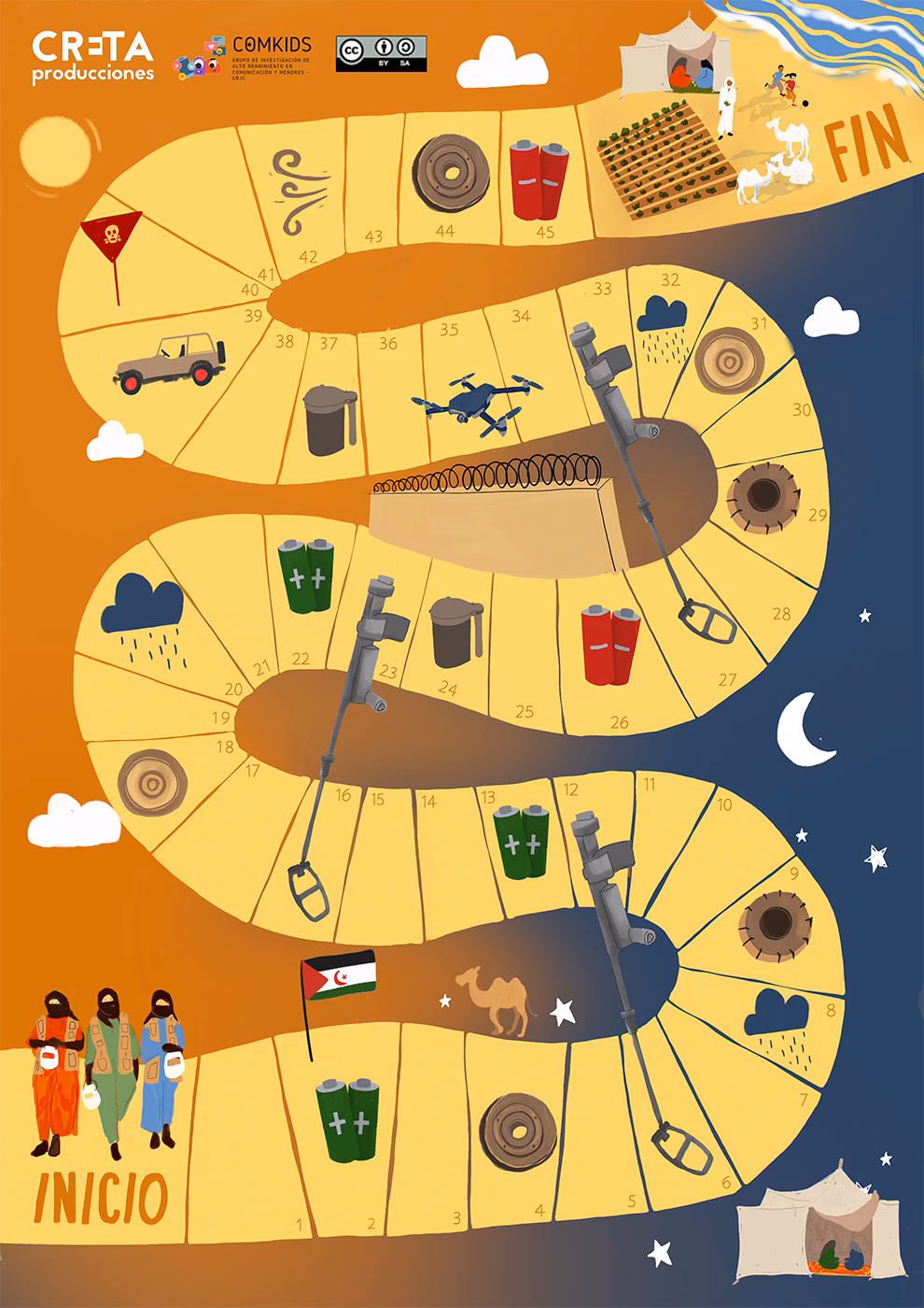 Pieza transmedia derivada del documental Disonancia (Raquel Larrosa, nominado a los Goya 2026), El Cruzaminas es un juego actualmente distribuido en centros escolares del Sáhara Occidental como herramienta educativa de apoyo al trabajo de SMAWT (Saharawi Mine Action Women Team) para concienciar a la infancia sobre las minas antipersona aún presentes en el territorio. Una propuesta lúdica y educativa que invita a reflexionar sobre el papel de las mujeres en contextos de conflicto y la violencia que estas armas siguen ejerciendo en la vida saharaui.