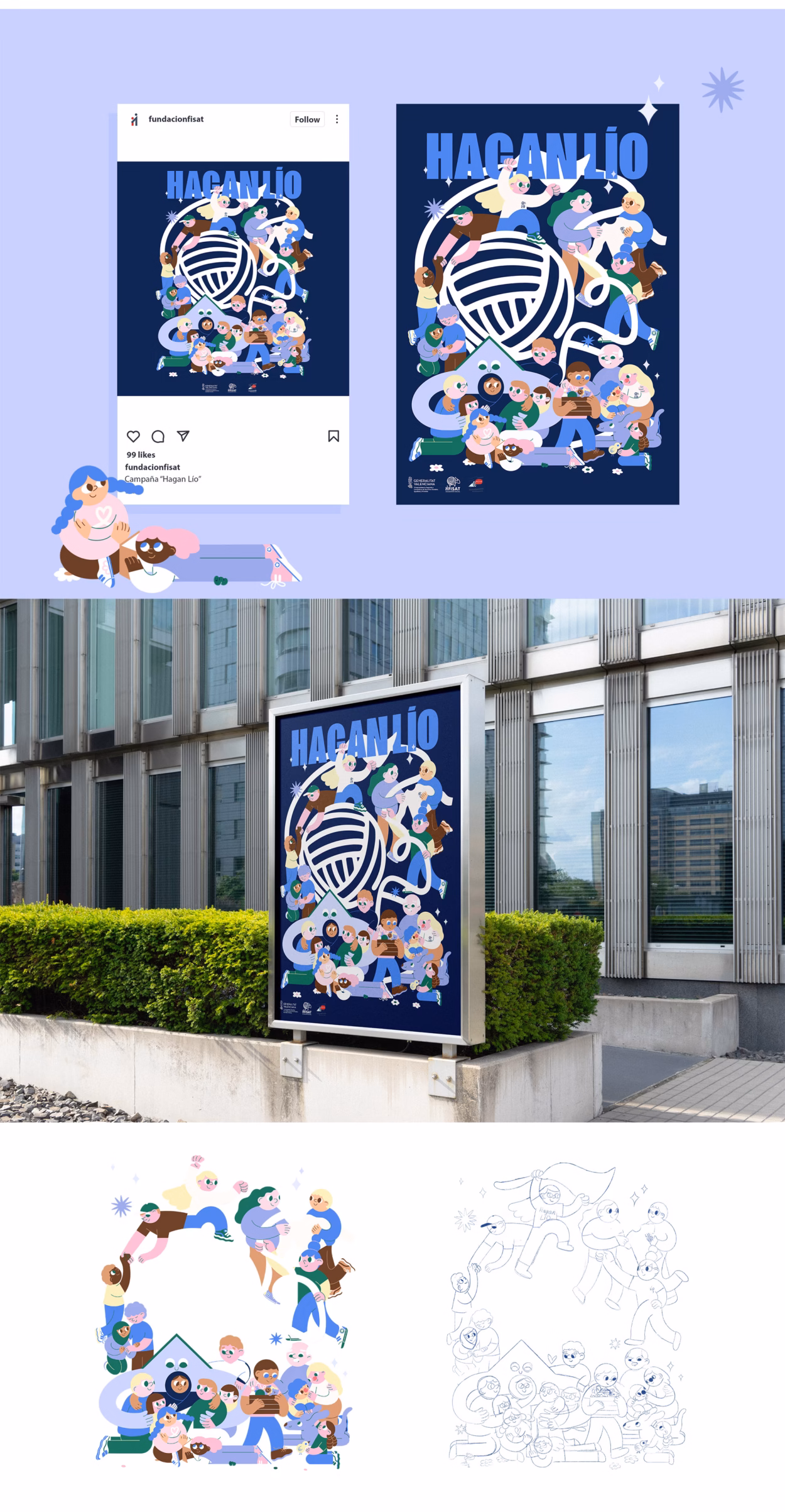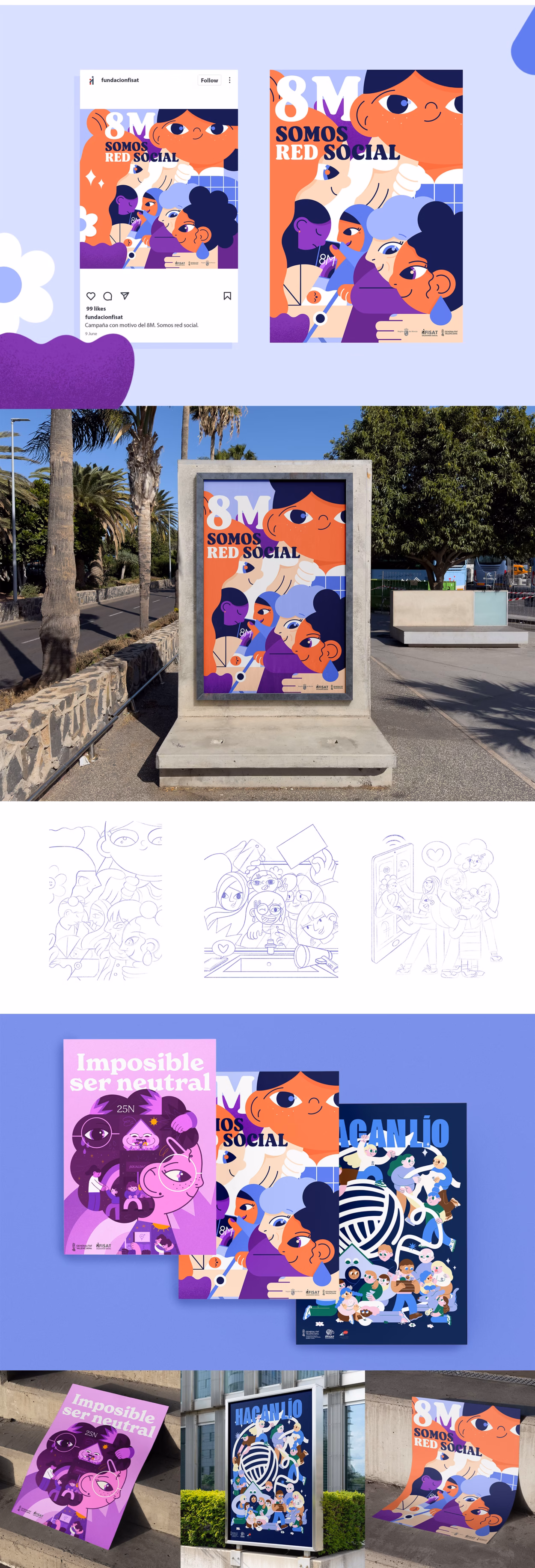 Serie de ilustraciones y diseño gráfico desarrollados para FISAT con motivo del 8M, el 25N y el Día del Voluntariado. El proyecto utiliza la ilustración como herramienta de comunicación social, creando imágenes capaces de visibilizar, sensibilizar y conectar con la ciudadanía.