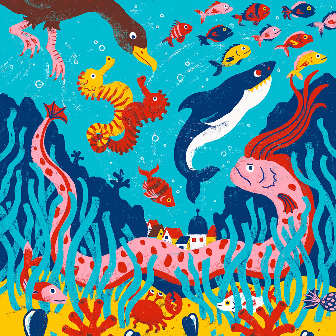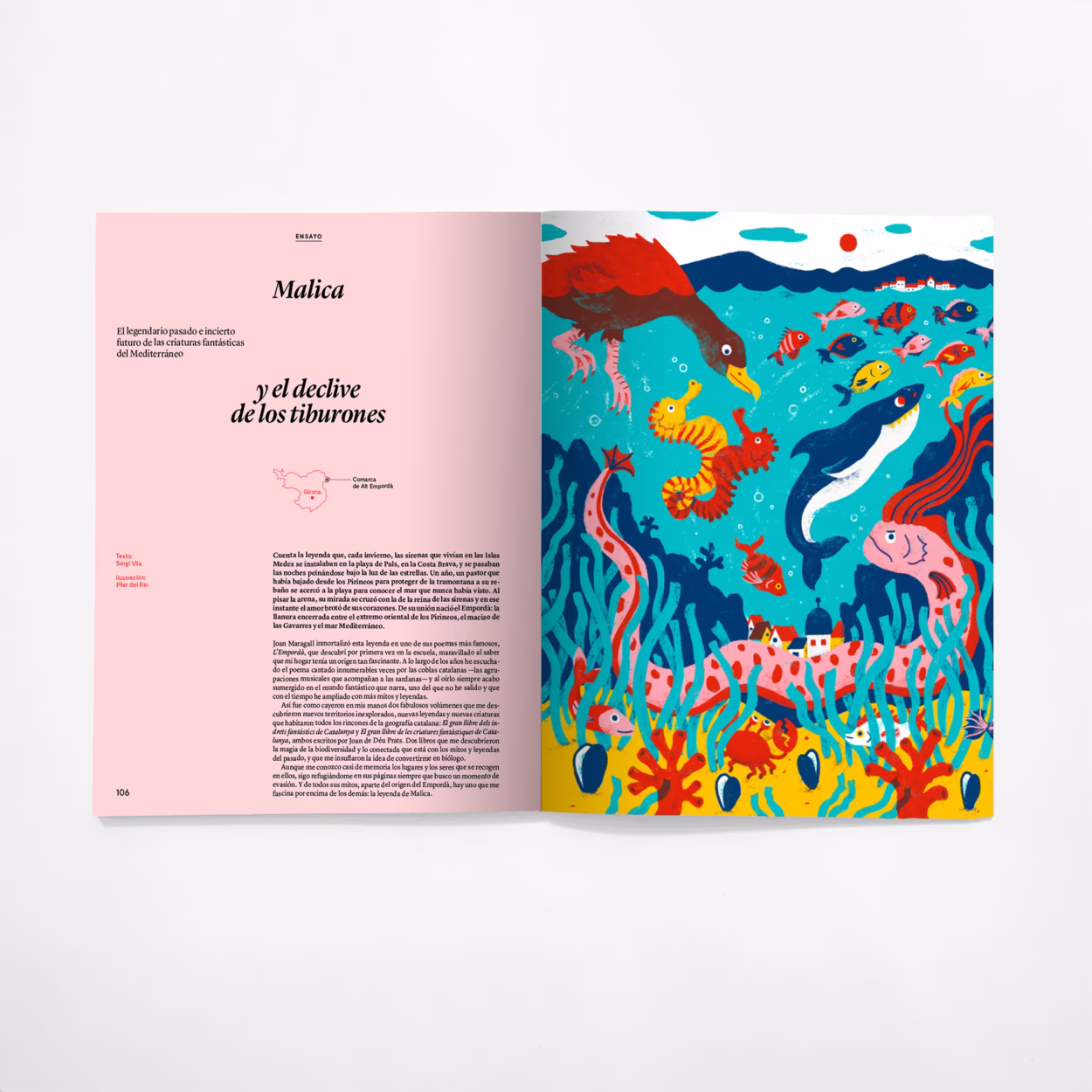 Esta es la ilustración que hice para el artículo “Malica y el declive de los tiburones” de la @revistasalvaje . Se basa en el texto de Sergi Vila, quien explora algunos mitos del Mediterráneo que en su momento contribuyeron a proteger la fauna local, pero que ahora se ve amenazada por diversas causas.